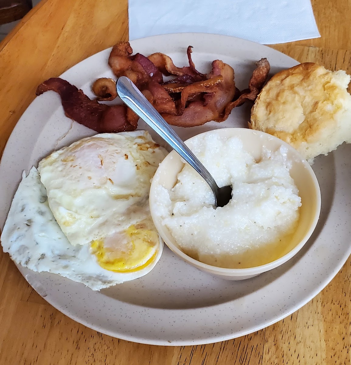 What a pleasant surprise! We are visiting from Texas and found this fabulous place to eat. They had a breakfast buffet and offered many options. The biscuits are yummy, super soft, and the gravy has great flavor. They were constantly filling the buffet line with fresh items. As for the staff, they were super pleasant and helpful. You feel like a family member sitting down for breakfast. Thank you for a wonderful experience!